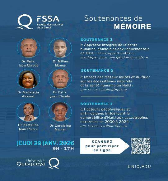La Faculté des Sciences de la Santé de l’Université Quisqueya a le plaisir d’annoncer la tenue de trois soutenances de mémoire portant sur des thématiques majeures pour le développement durable d’Haïti :